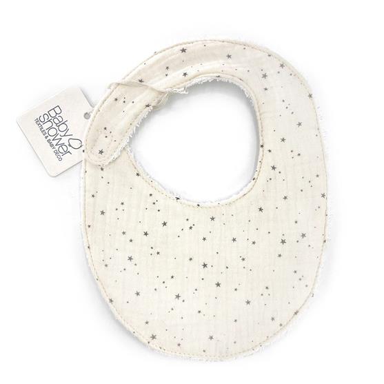 Babero para los primeros meses y hasta que cumpla un año. Frontal en tejido de algodón estampado. Reverso con toalla de rizo blanco de alto gramaje. Cierre con Velcro.