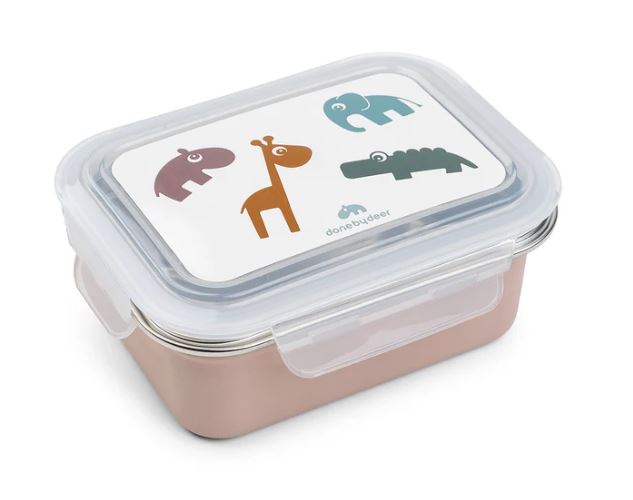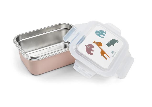 La práctica caja de almuerzo de metal es de un tono empolvado. La tapa está decorada con los ciervos amigos Croco, Elphee, Raffi y Ozzo en tonos suaves de verde, azul, mostaza y polvo.