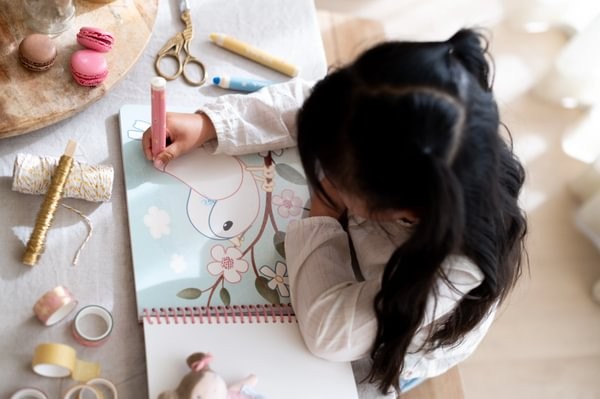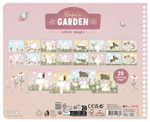 Libro mágico inspirado en el jardín de la muñeca Rosa, incluye lápices de colores de madera, 20 páginas impresas y 10 páginas en blanco.