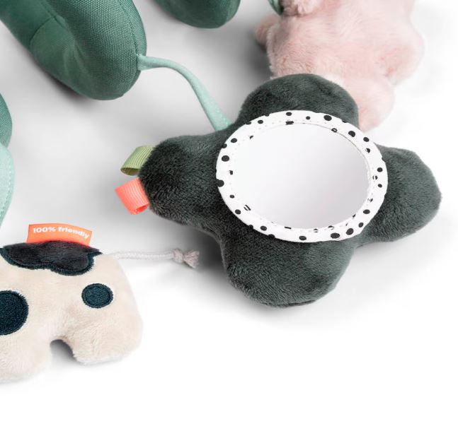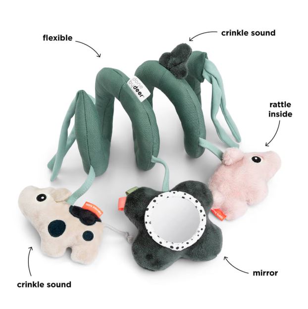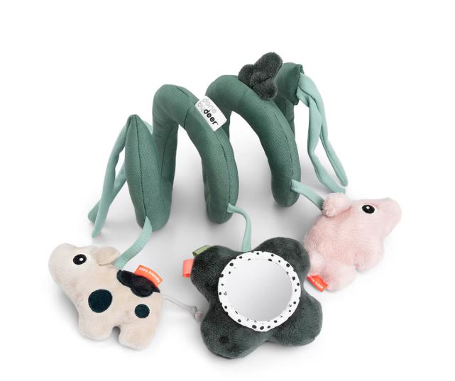 Ligera y fácil de transportar, la espiral puede fijarse a la cuna, la silla del coche, la silla de paseo o el cochecito gracias a sus suaves cuerdas. Con su fresco color verde, sus coloridos detalles y sus juguetones contrastes, ofrece estimulación visual mientras los amigos ciervos entretienen a tu bebé sobre la marcha.