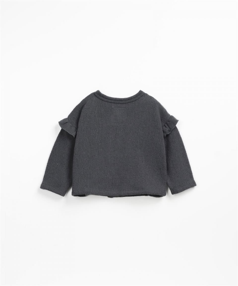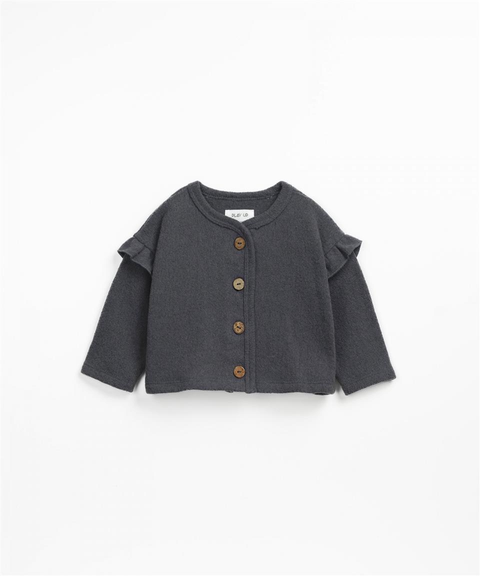 Esta chaqueta está confeccionada con punto mezcla de fibras recicladas, y su composición contiene 33% de nuestro hilo reciclado Re(Play). Es un modelo con interior cardado, tiene cuello redondo, detalle de volante en las mangas y abertura frontal con botones de coco.