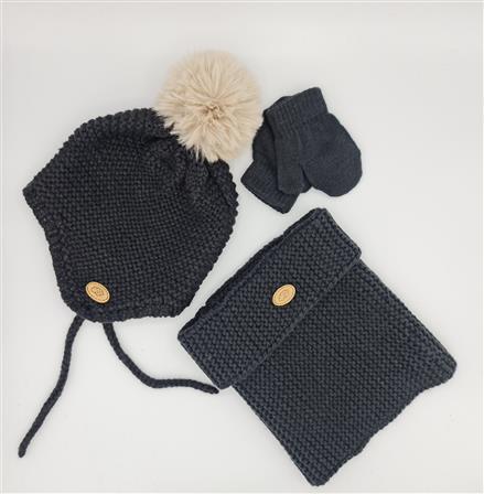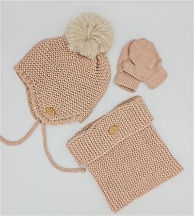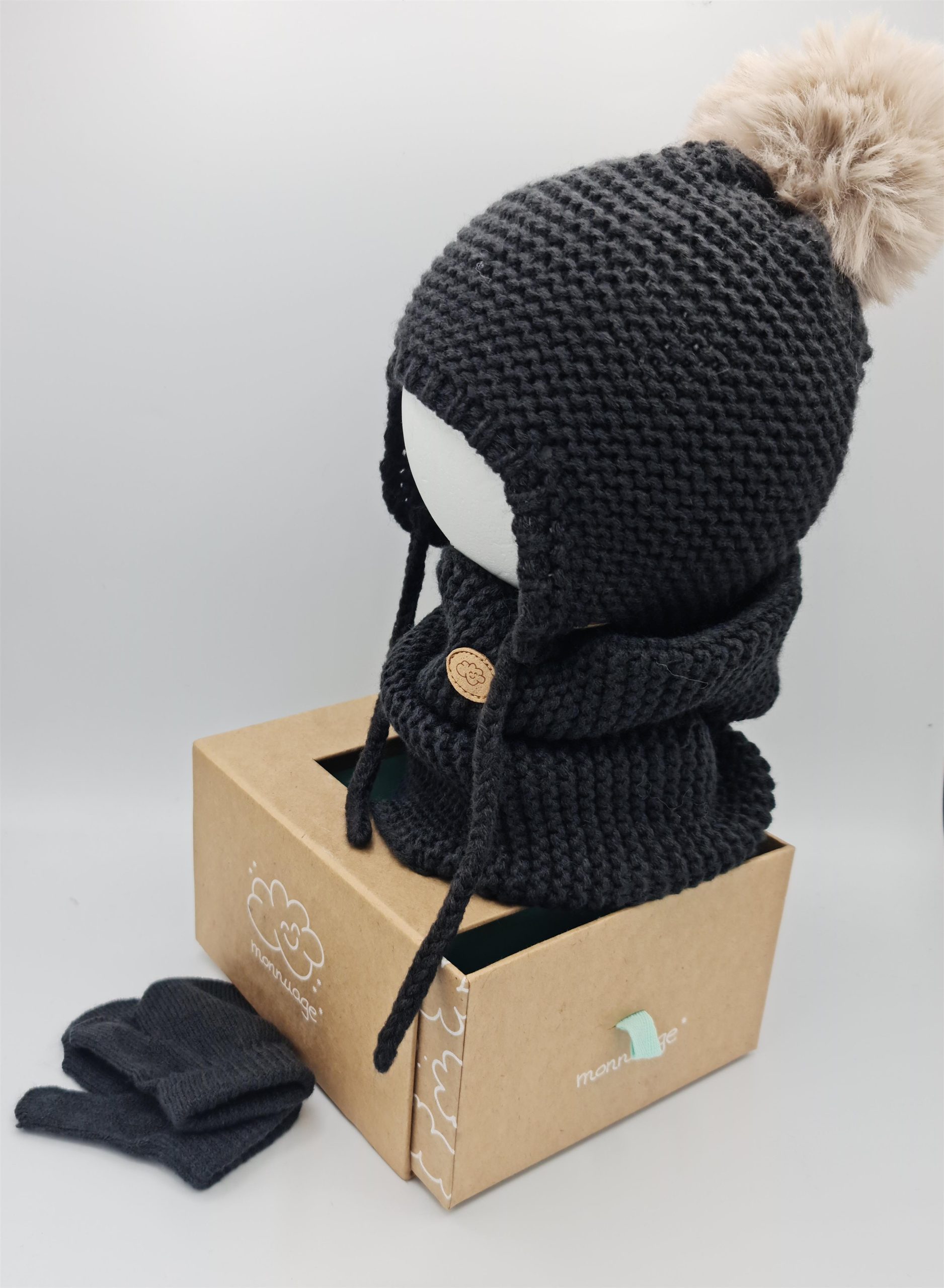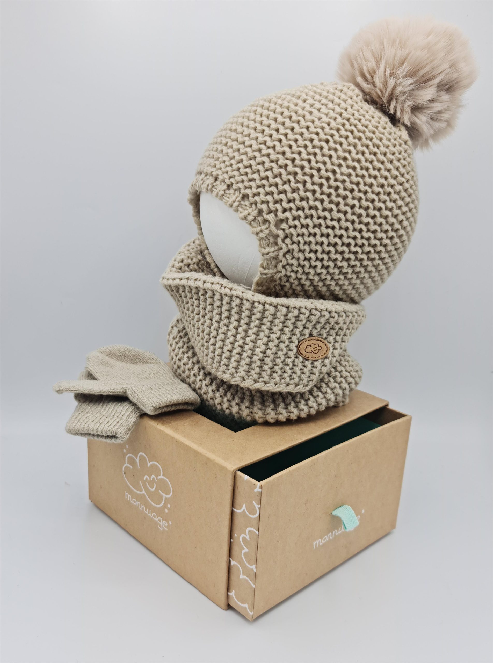 Conjunto Monnuage de 3 piezas formado por gorro, cuello recto y manoplas. Punto bobo grueso, con pompón de pelo sintético y cubreorejas.