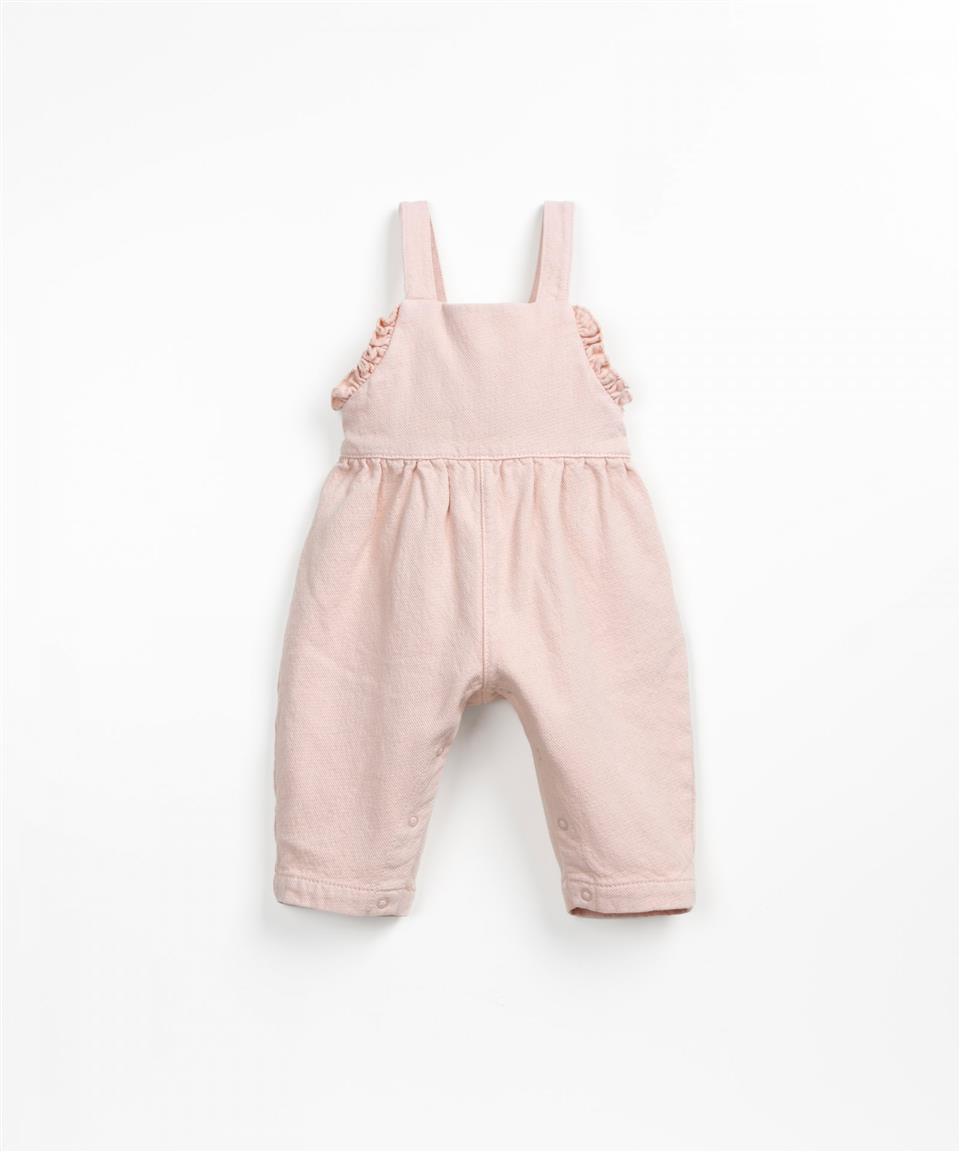 Este mono está confeccionado con tela de algodón orgánico. Es un modelo con cuello cuadrado y tirantes, tiene una abertura en la espalda con botón de coco, y abertura en la entrepierna con corchetes de metal sin níquel (abertura en la entrepierna hasta la talla 18M). Esta pieza es única y especial porque fue teñida a través de la técnica de teñido de prendas. Este tipo de teñido se aplica después de que la prenda está confeccionada, pudiendo originar suaves imperfecciones de color.
