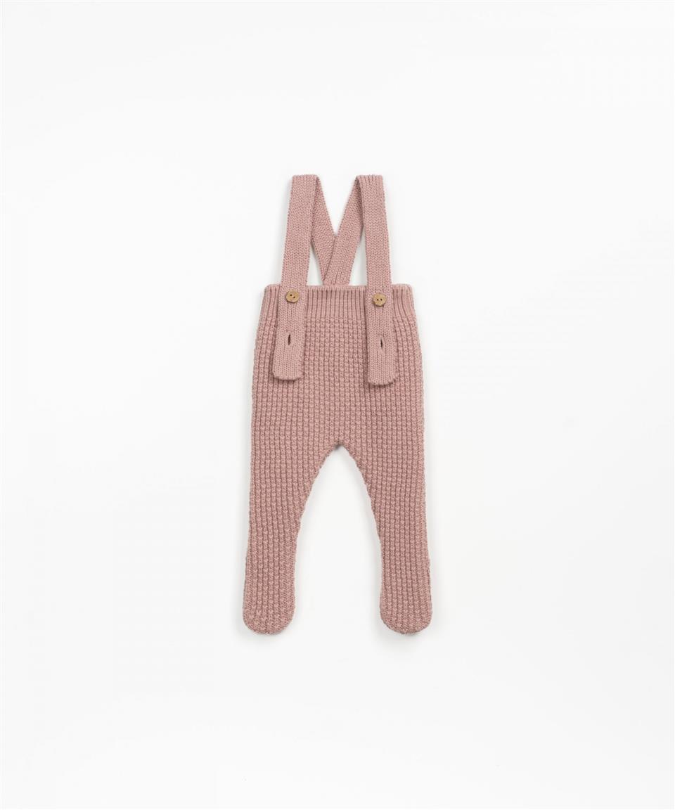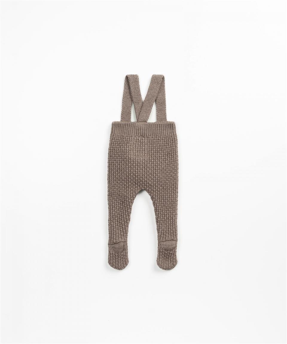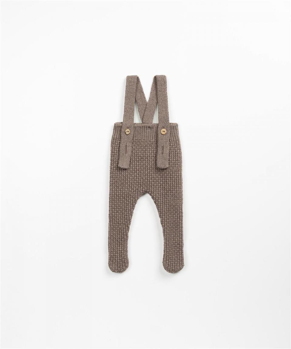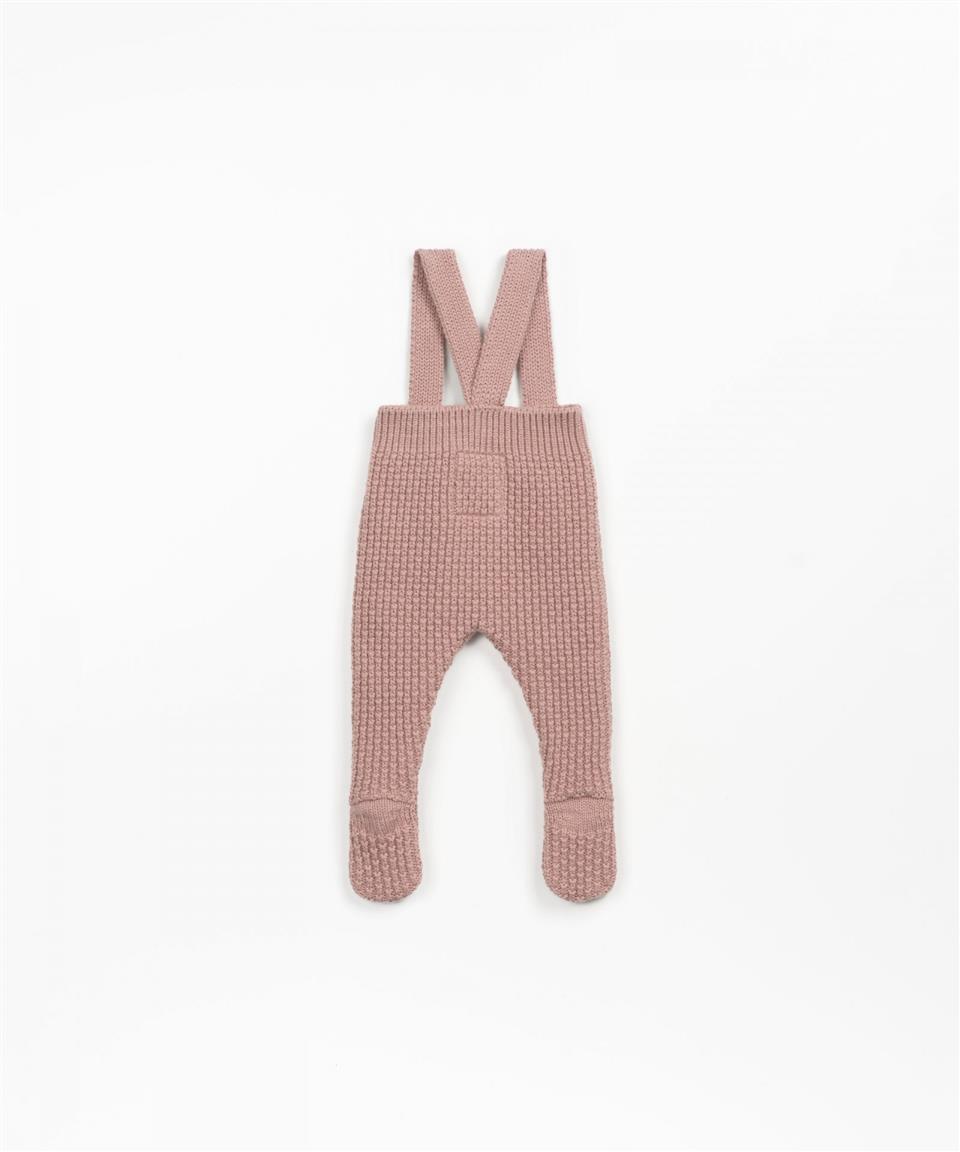 Este mono está confeccionado con punto tejido mezcla de algodón y lana. Es un modelo con pie, tiene tirantes regulables que cierran por delante con un botón de coco.