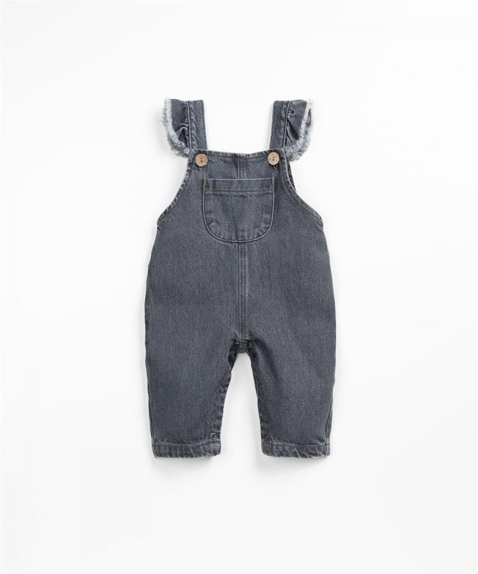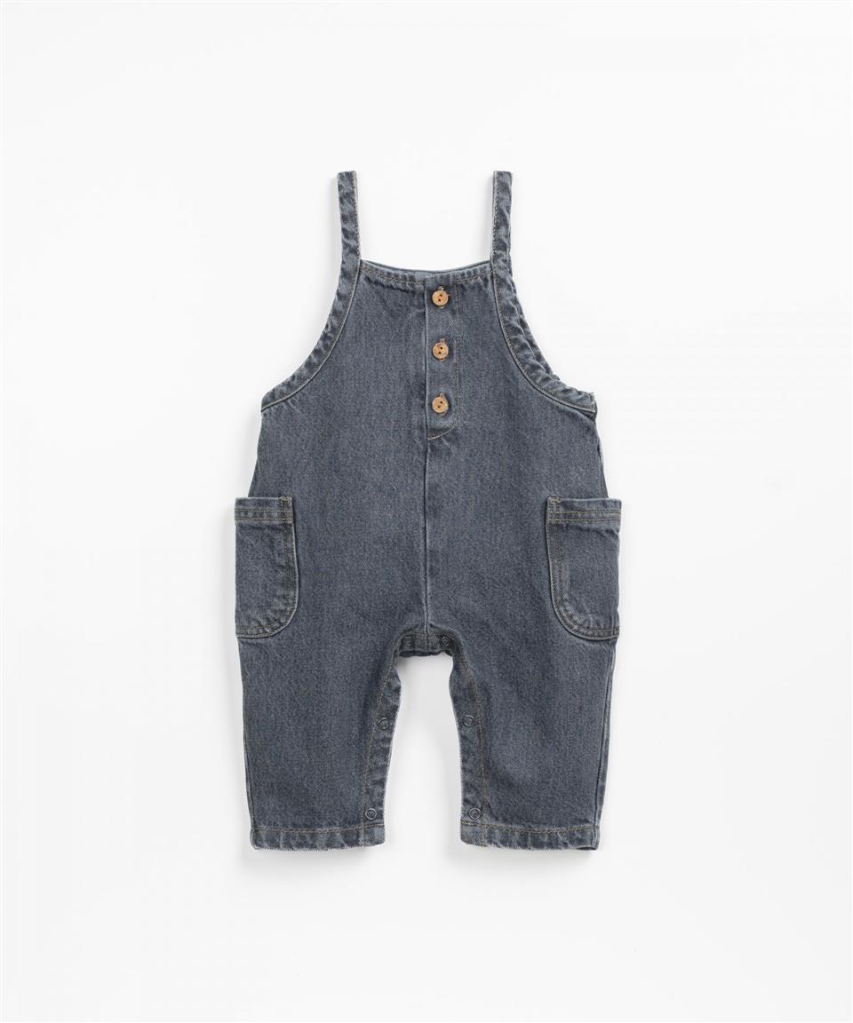 Este mono está confeccionado con tela mezcla de algodón y lyocell. Es un modelo con cuello cuadrado y detalle en los tirantes, tiene una abertura frontal con botones coco, un bolsillo y abertura en la entrepierna con corchetes de metal sin níquel (abertura en la entrepierna hasta la talla 18M).