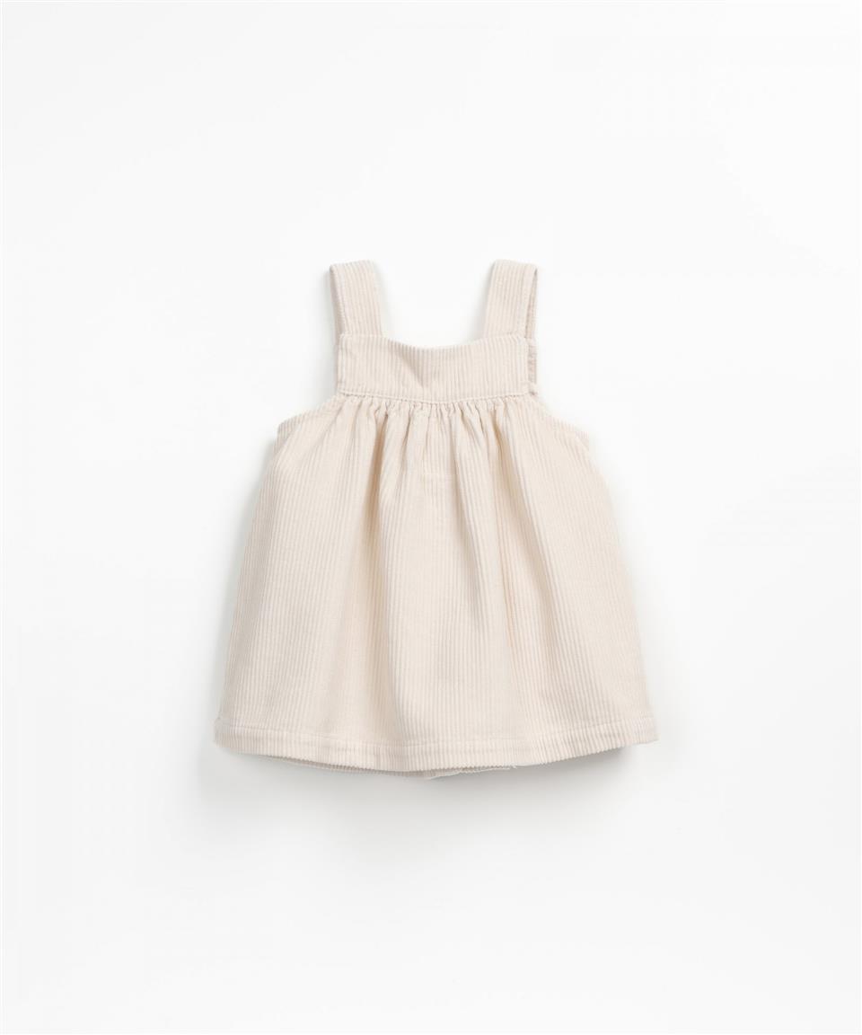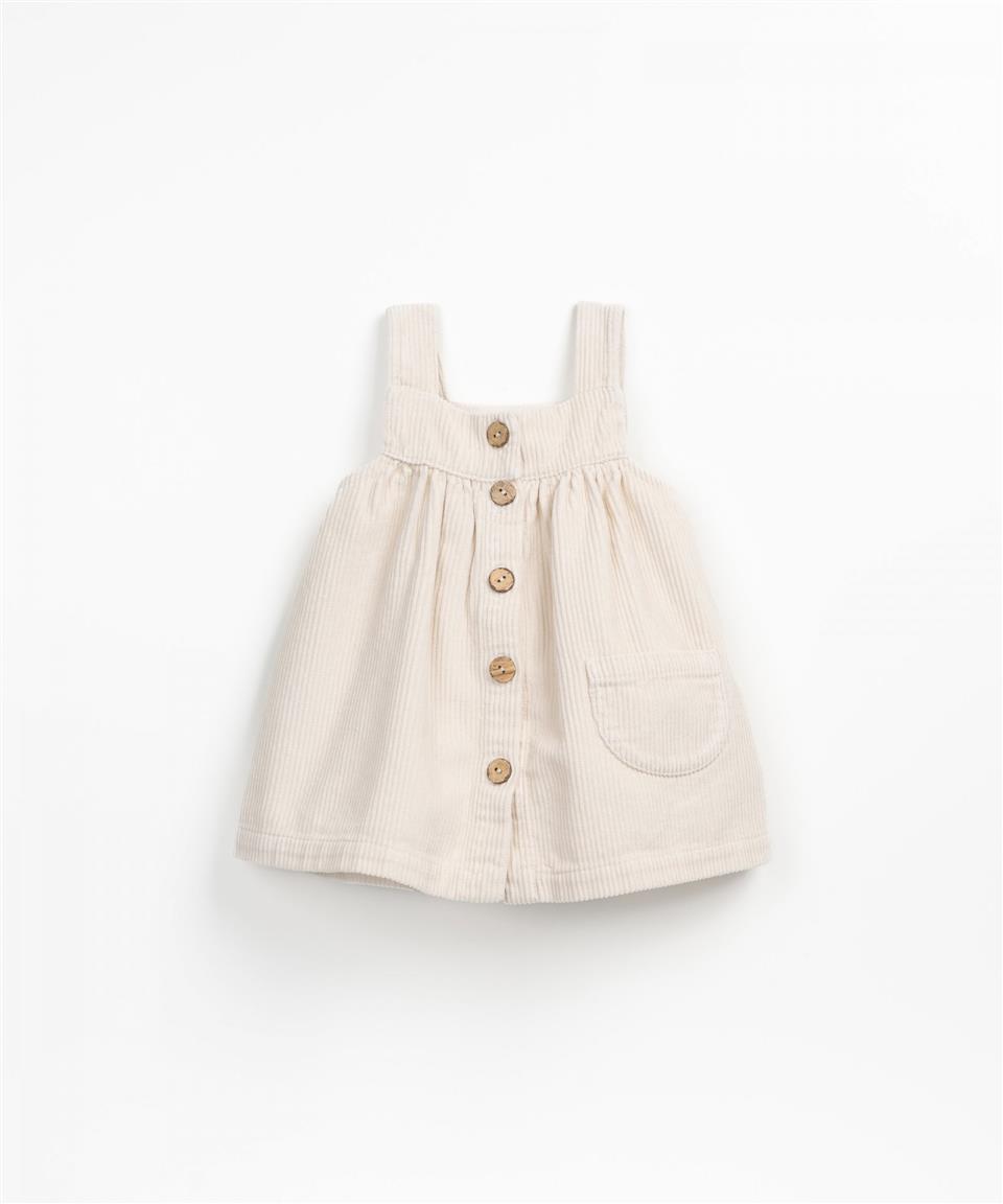 Este vestido está confeccionado con tela de algodón reciclado y algodón. Es un modelo con tirantes y cuello cuadrado, tiene una abertura frontal con botones de coco y un bolsillo. Esta pieza es única y especial porque fue teñida a través de la técnica de teñido de prendas. Este tipo de teñido se aplica después de que la prenda está confeccionada, pudiendo originar suaves imperfecciones de color.