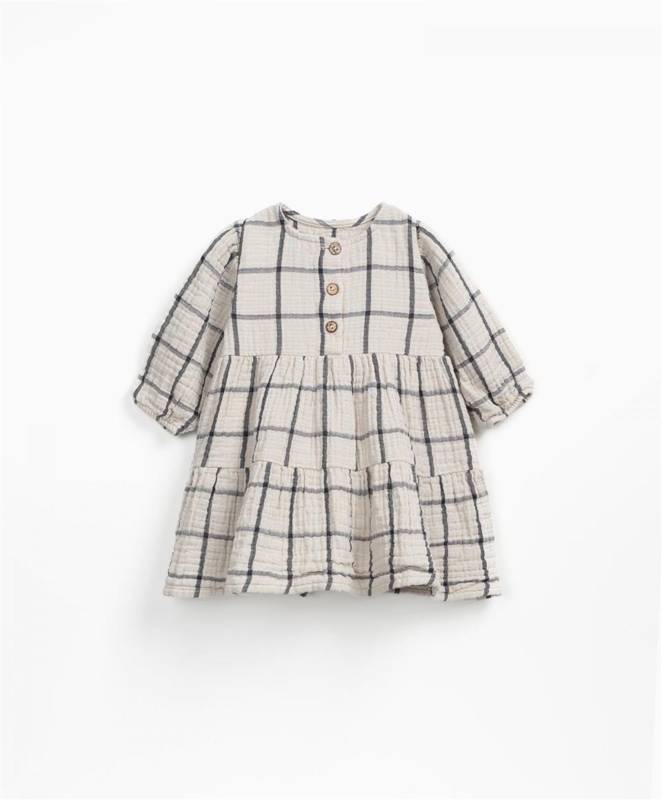 Este vestido está confeccionado con tela de algodón orgánico. Es un modelo con cuello redondo, tiene una abertura frontal con botones de coco, goma en los puños y estampado de ajedrez.